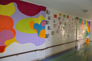簡短的捐贈手續辦理完後,我們在工(gōng)作人員(yuán)的帶領下(xià),一(yī)起參觀了福利院的生(shēng)活區。幹淨明亮的走廊,湖(hú)綠色的地面,點綴著(zhe)可愛卡通(tōng)畫(huà)的牆面,福利院處處充滿著(zhe)童趣和純真。
