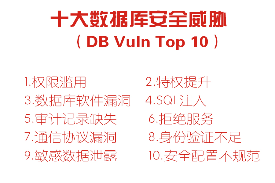 企業(yè)組織的數據庫體系,不僅僅是數據庫軟件(jiàn)平台本身,不會(huì)流動的數據沒有意義,當我們考慮數據庫安全的時候,顯然我們需要合理評估數據庫的受攻擊面大小(xiǎo);數據庫訪問涉及的認證、授權和審計問題;由于開(kāi)發人員(yuán)疏忽帶來的軟件(jiàn)漏洞和運維人員(yuán)的管理不善導緻的潛在風險等,不難發現在實際運維中,各種各樣的風險都可能(néng)産生(shēng)并帶來可怕的後果。筆者實驗室通(tōng)過收集各漏洞平台及企業(yè)安全運營者的反饋數據庫安全信息,參考OWASP TOP 10制定了數據庫應用防禦的十大數據庫風險威脅列表。