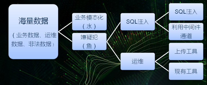 那在解決其方法的技(jì)術(shù)上(shàng),我們通(tōng)過對業(yè)務SQL語句的關鍵字、邏輯關系等特征自(zì)動采樣學習,并結合高(gāo)性能(néng)的SQL語義分析計算(suàn),構建對應的SQL語法樹,完成模态數據建模。在實際應用環境中,海量的數據主要包括以下(xià)三種數據:業(yè)務數據、運維數據、非法數據;而數據量占比最大的就(jiù)是正常的業(yè)務數據。我們通(tōng)過自(zì)動化學習,把正常的業(yè)務模态化數據流分離出來,把存在惡意攻擊的語句識别出來。在惡意攻擊語句中,SQL注入和中間件(jiàn)通(tōng)道複用兩種攻擊是難中難,同時也是重中重。其難以被發現,所以成為(wèi)防護中重要環節的重點防護對象。